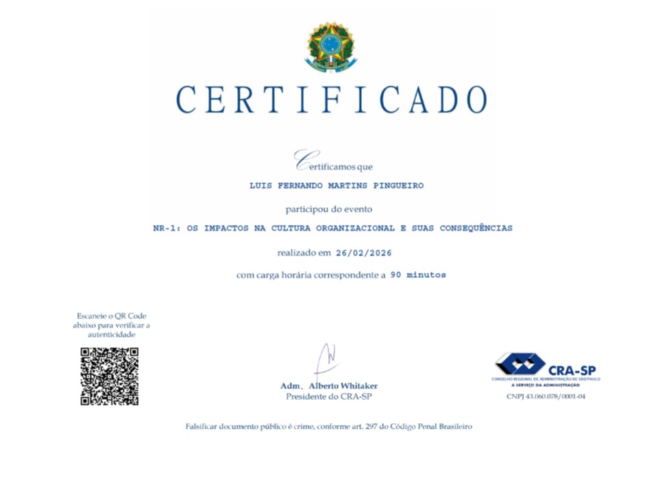 Participei do evento “NR-1: Os Impactos na Cultura Organizacional e suas Consequências”, promovido pelo CRA-SP.